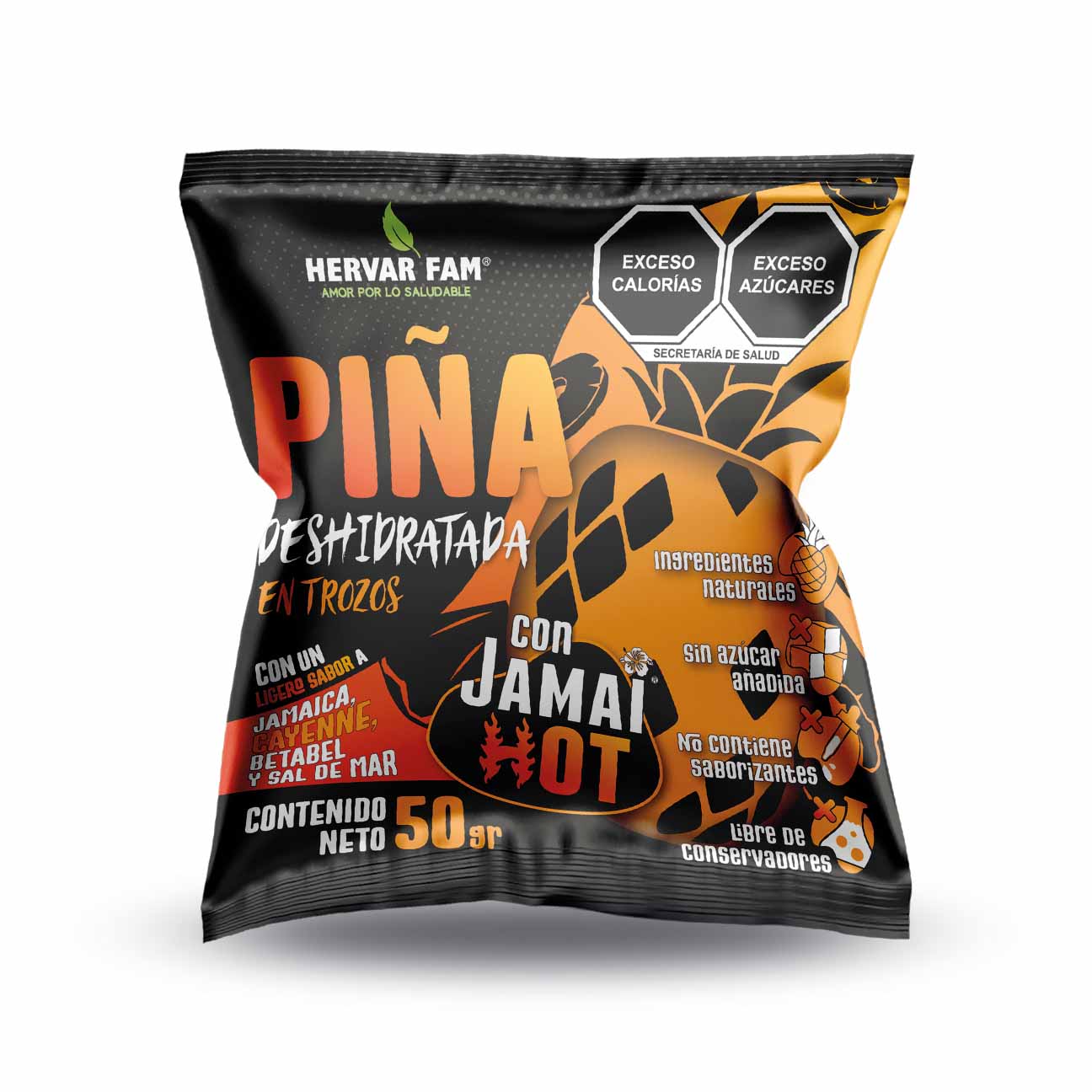 - Nombre del producto: Piña Deshidratada en Rodajas con JamaiHot (cayenne, sal de mar, jamaica)